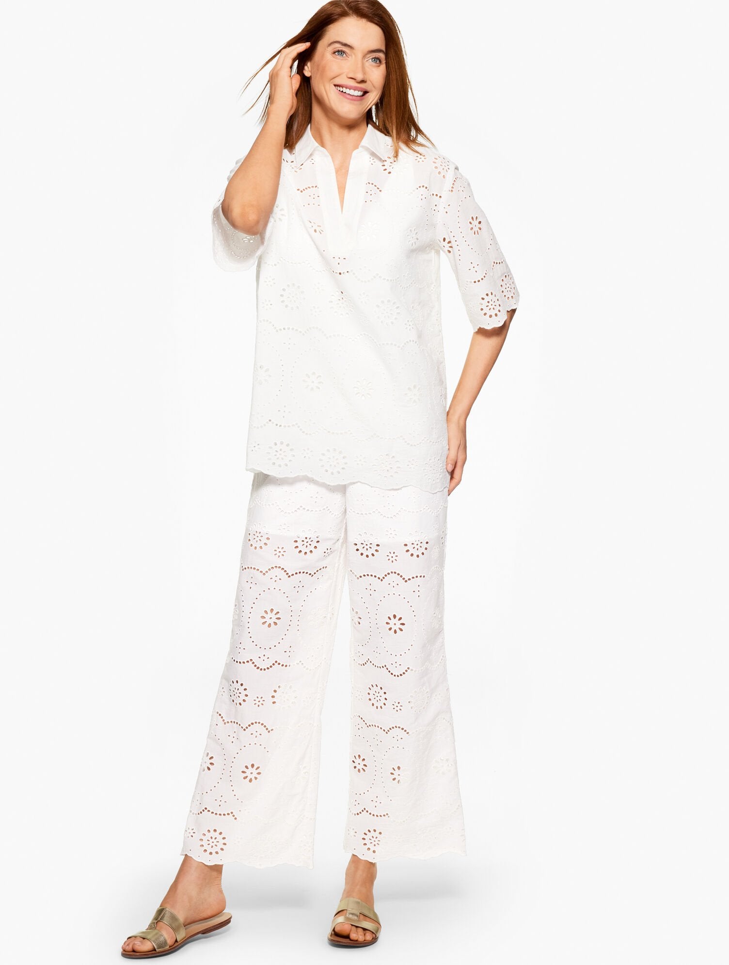 Airy eyelets add a semi sheer touch to our effortless cover-up shirt. Popover silhouette features pretty scallop embroidery at the elbow sleeves and hem. Make it a set with the matching Aqua Club Eyelet Pant Cover-Up.