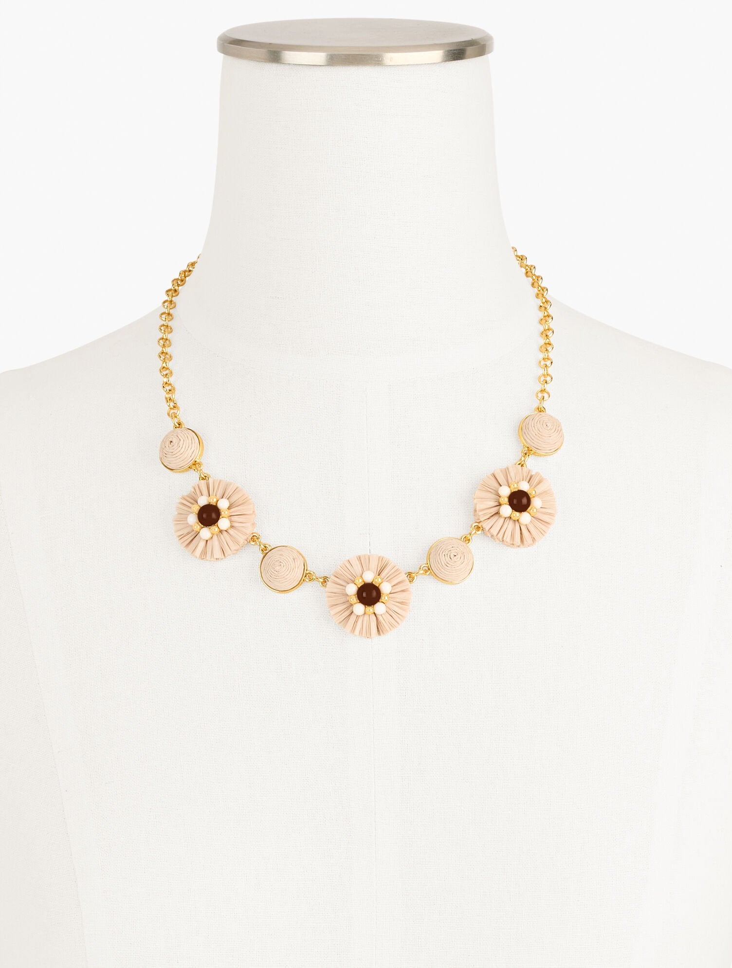 Gorgeous beads and woven raffia add lush texture to this stunning necklace. Crafted from glossy gold. The perfect addition to your summery ensembles.
