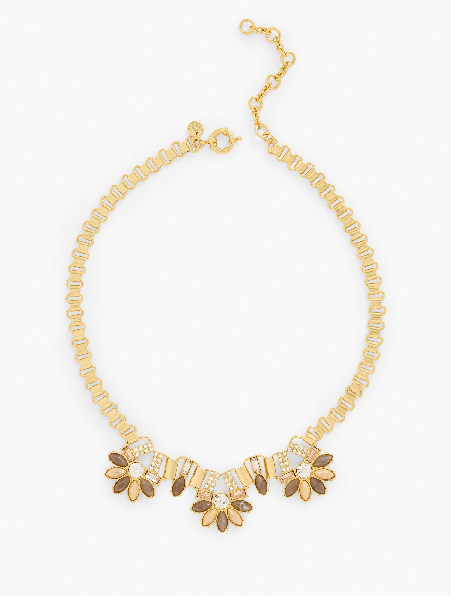 Bring eye-catching shine to any look with this stunning statement necklace. Crafted with scattered gemstones at the center. Beautifully textured. The perfect way to polish up your look.