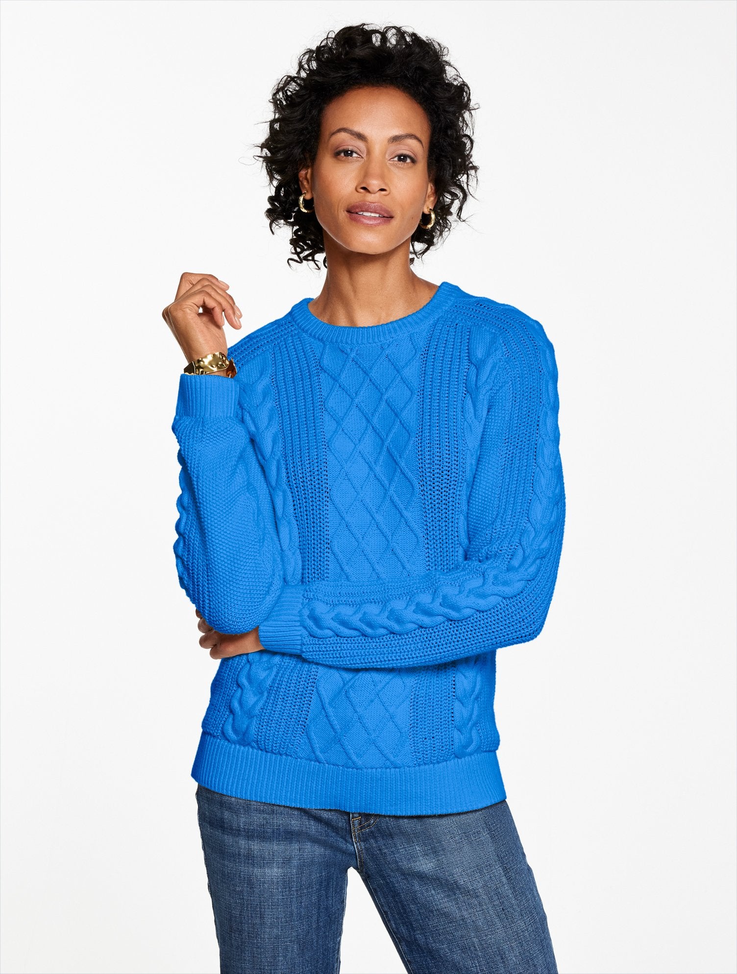 Chunky cable knit adds just-right texture to this effortless sweater. Crafted from heavenly soft cotton with a classic crewneck.