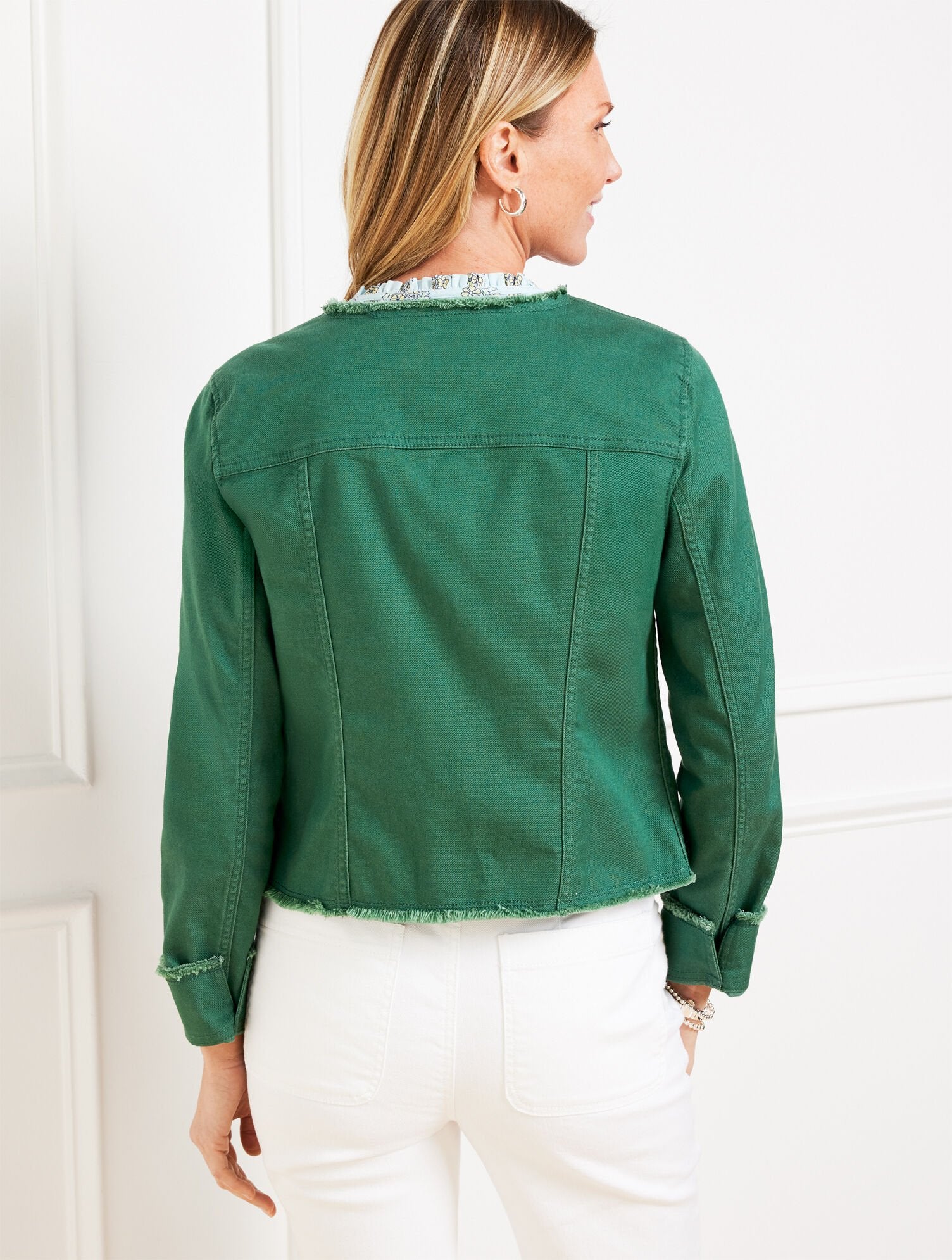 A comfortable favorite for the in-between season. Layer in some casual-chic style with this relaxed jean jacket. Crafted in a collarless design with a frayed hem and button flap pockets.