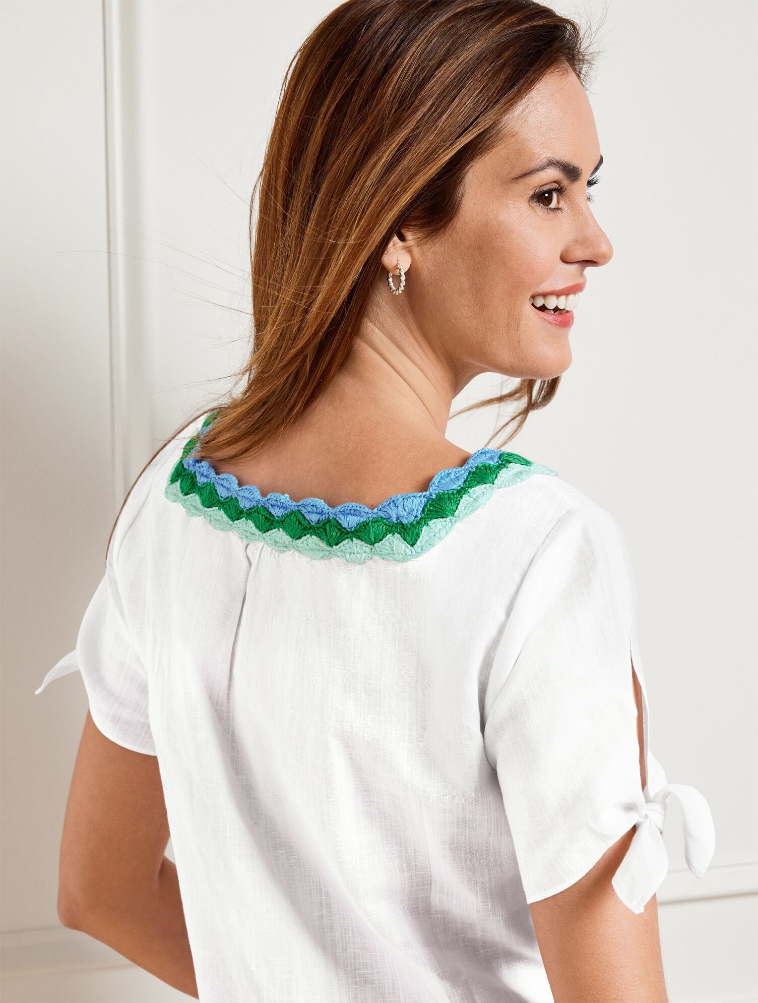 Exudes casual charm. Our polished square neck top is detailed with eye-catching crochet trim. Airy linen keeps you cool all season. Finished with playful ties at the sleeves.