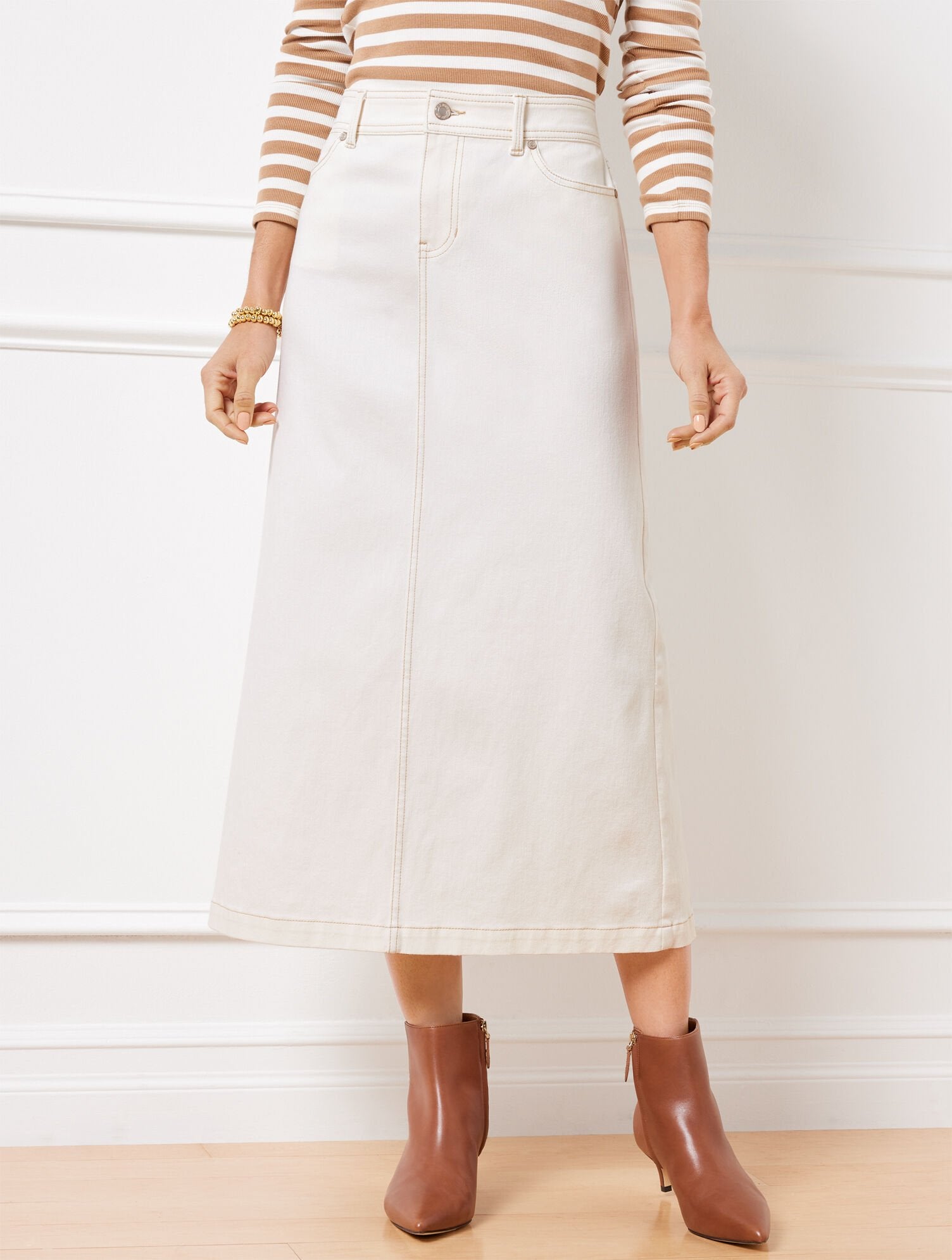 A chic back slit brings effortless movement to this season's staple denim skirt. Crafted from cotton with a hint of stretch and five-pocket styling. Perfect for work and beyond. Just add your favorite accessories.