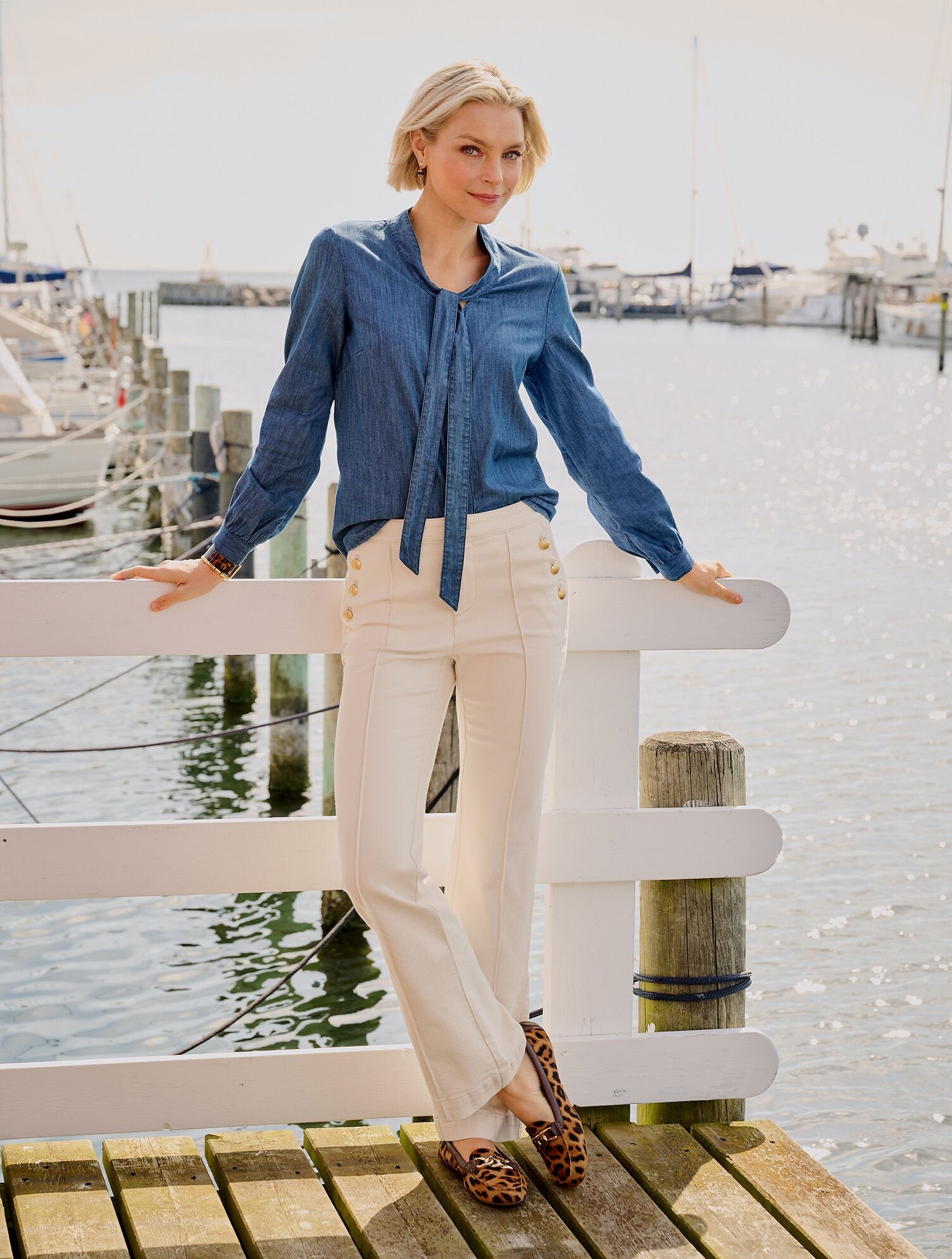 Our chic button front shirt elevated with a playful tie at the neck for an effortlessly stylish look. Made from vertically striated denim with a sleek box pleat at the back.
