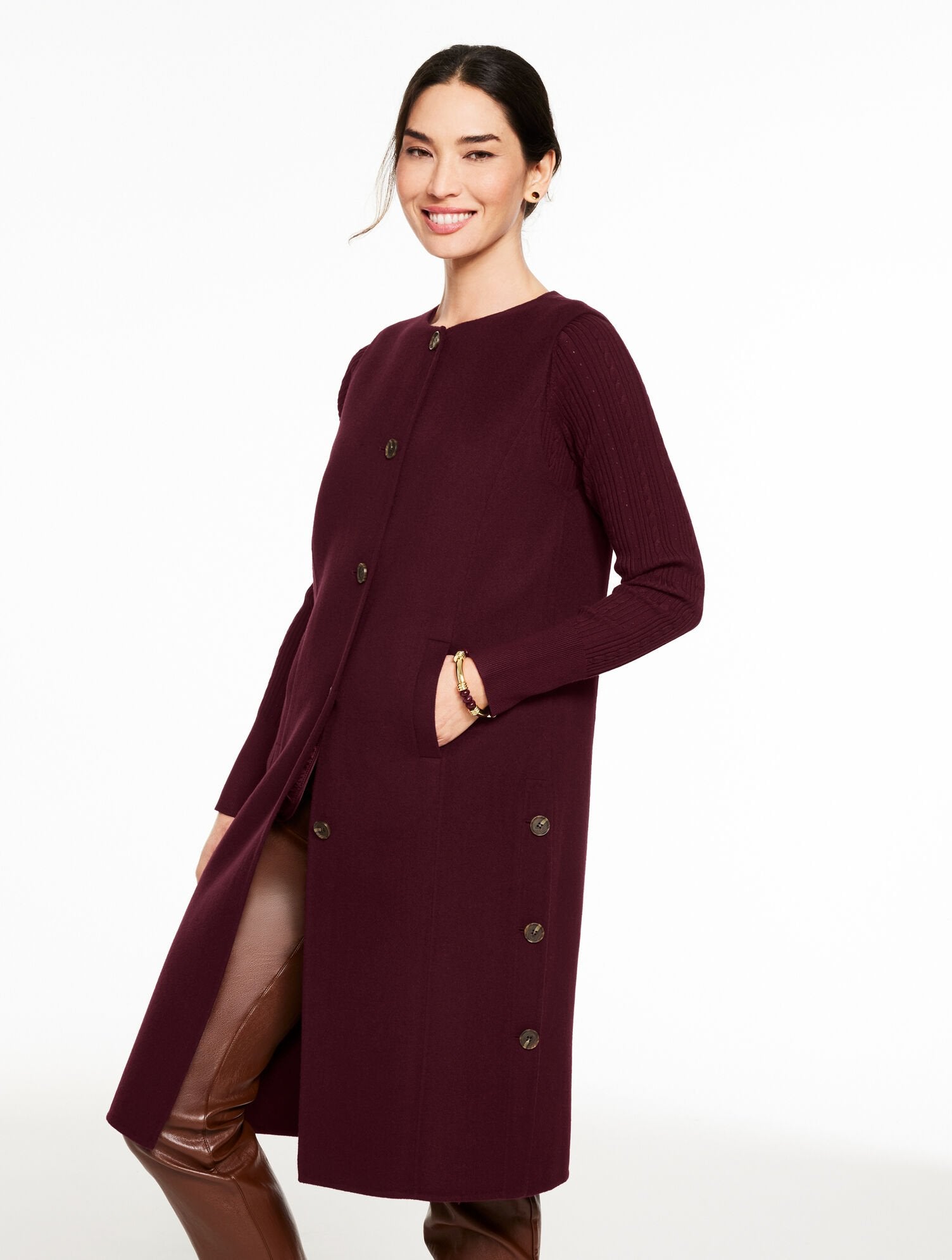 Sleek side buttons frame our sophisticated longline vest. Crafted from a heavenly soft wool blend with side pockets for your small essentials.