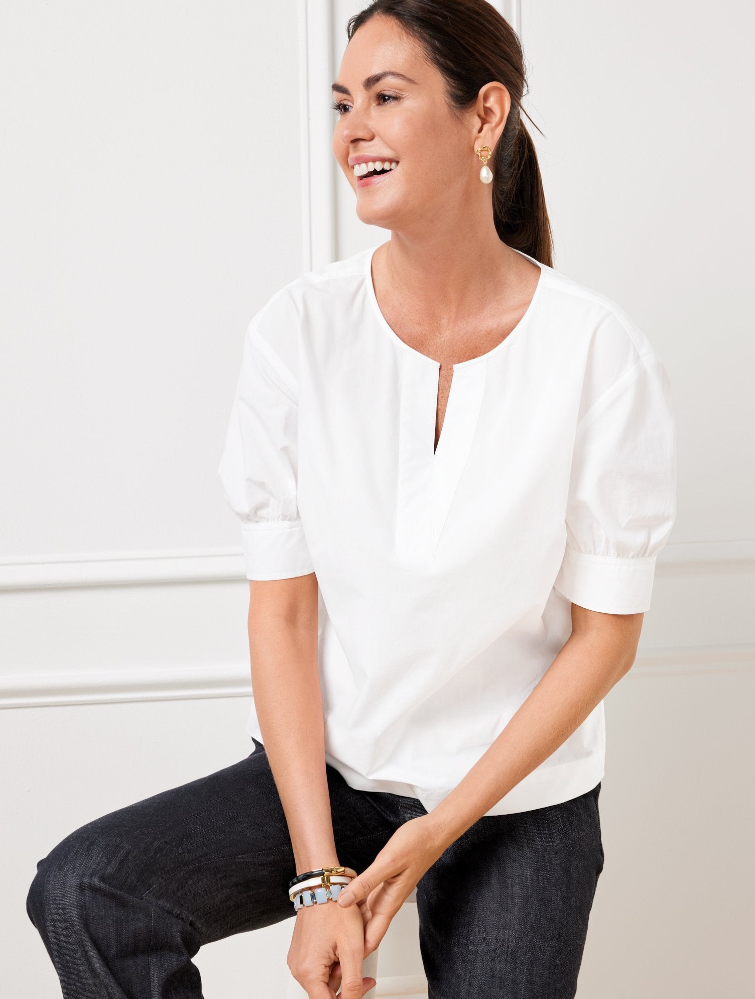 Our easy-to-style top in crisp cotton poplin. Detailed a flattering split neck and elbow length sleeves.