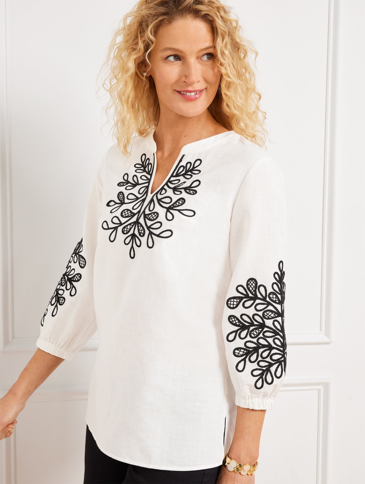 Our forever flattering tunic. In a cool blend of linen and cotton with beautiful embroidery at the front and sleeves. Detailed with three-quarter sleeves and side slits at the hem.