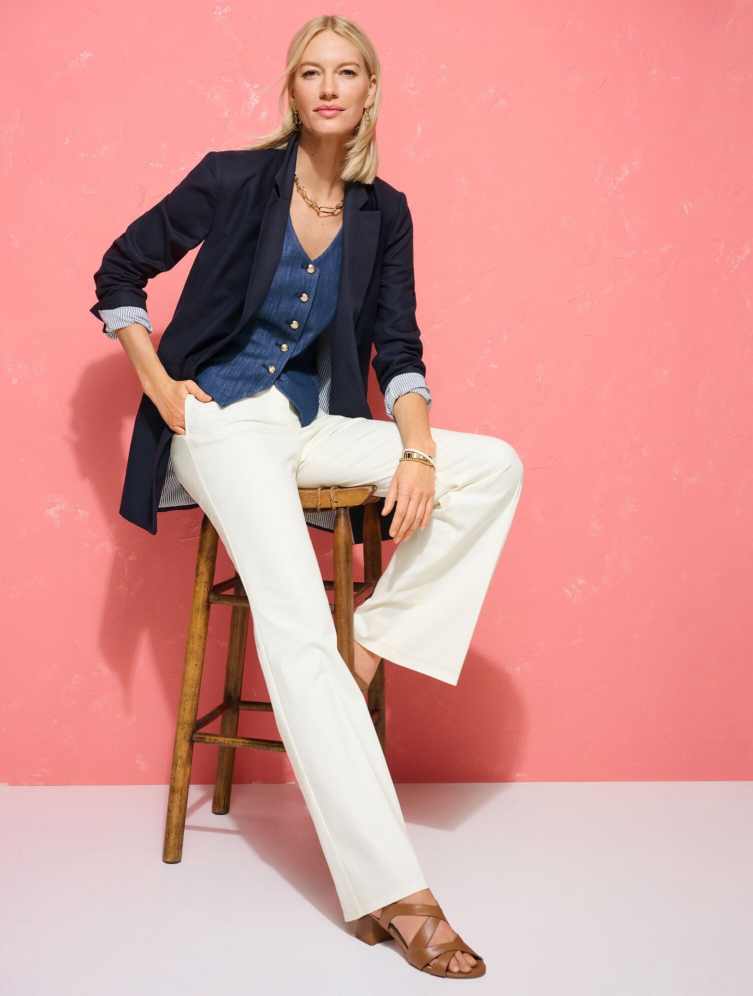 Tailored charm meets on-trend details. Our ultra-flattering flare leg pants in looks-good, feels-good twill. A modern must-have with a fabulous drape.