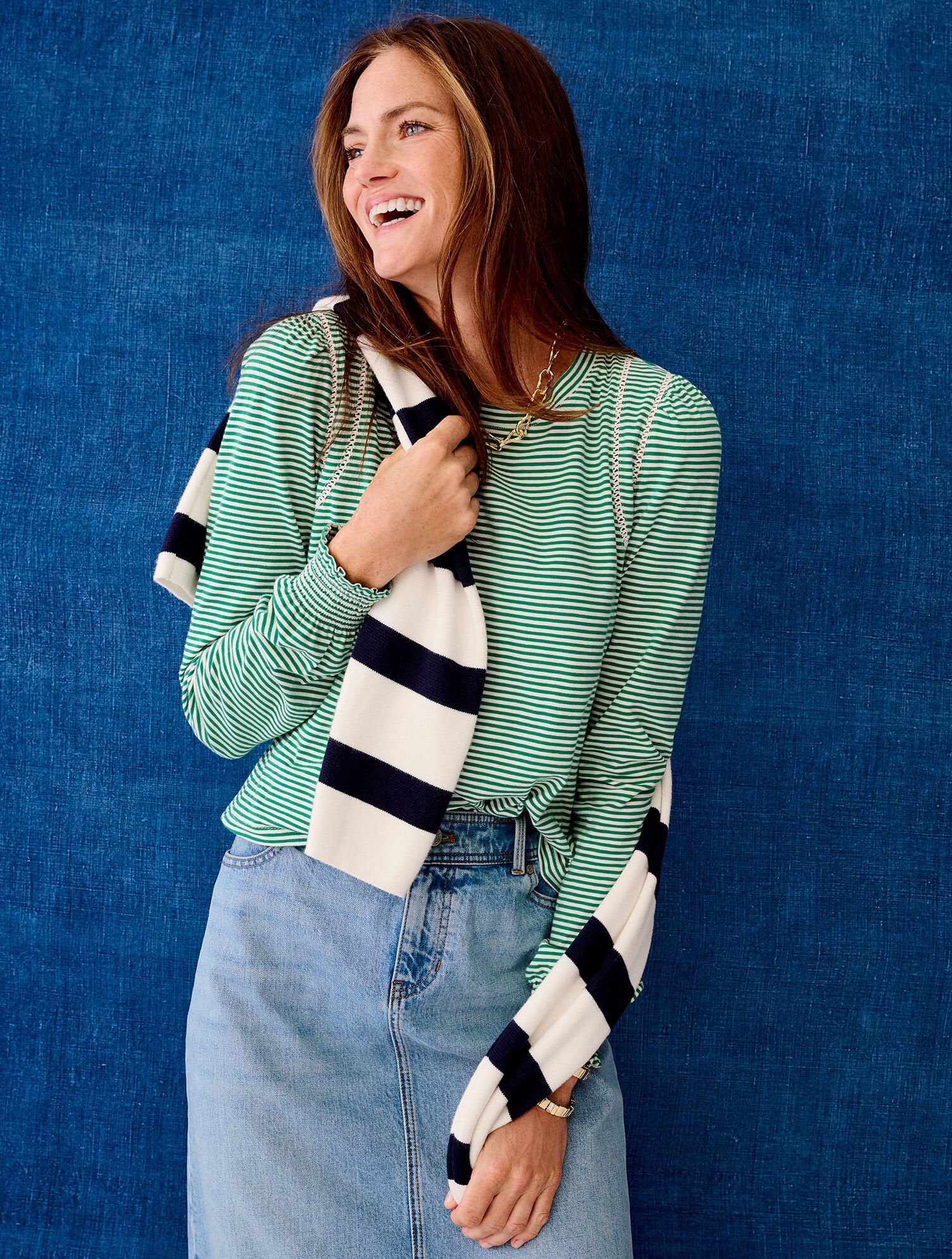 Delicate lattice trim adds a feminine touch to our soft tee. Crafted from heavenly soft cotton with a classic crewneck. In a fresh stripe print.