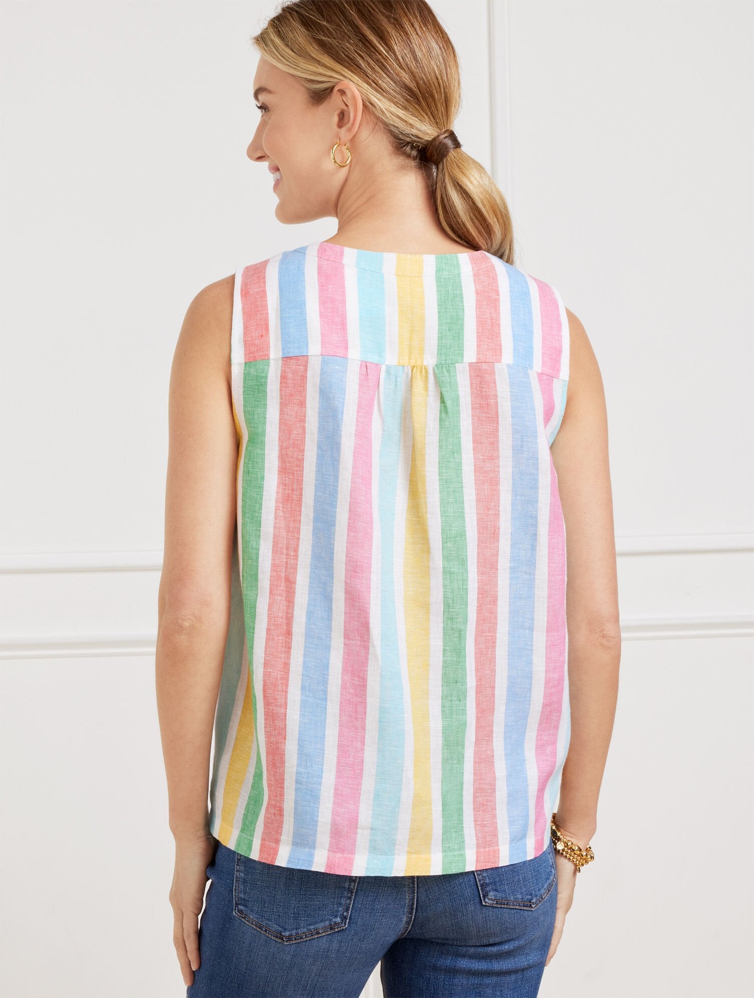 As pretty as it is polished. Our effortless shell is crafted in a prismatic stripe pattern to freshen up your wardrobe. Airy linen keeps you cool even on hot days. It's the perfect style to pop over your favorite jeans or linen shorts.