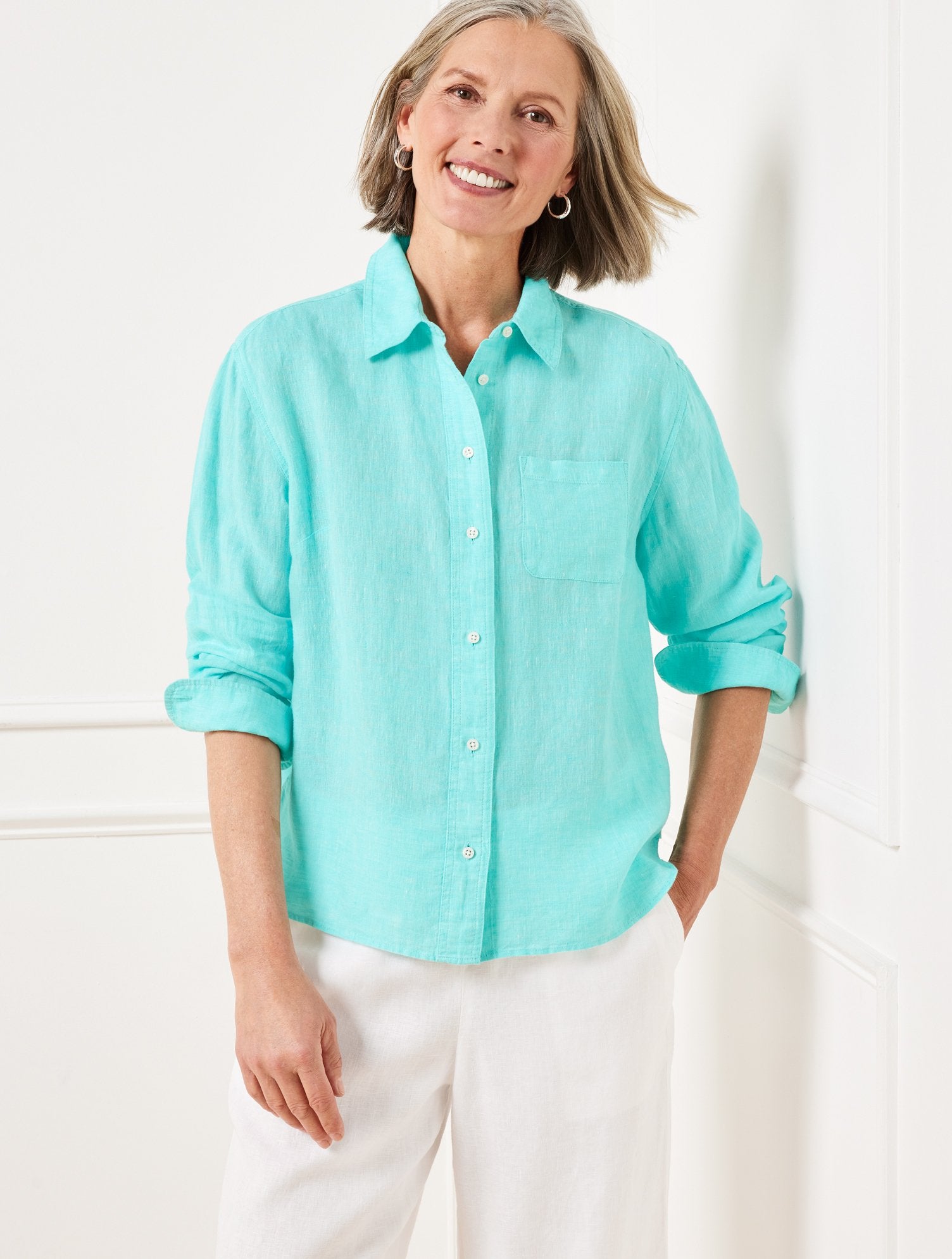 Live in linen this season with our modern, boxy shirt. Crafted in a cross dyed finish for a heathered look. Detailed with a patch pocket at the chest. Silhouette looks amazing with your favorite linen or denim shorts.