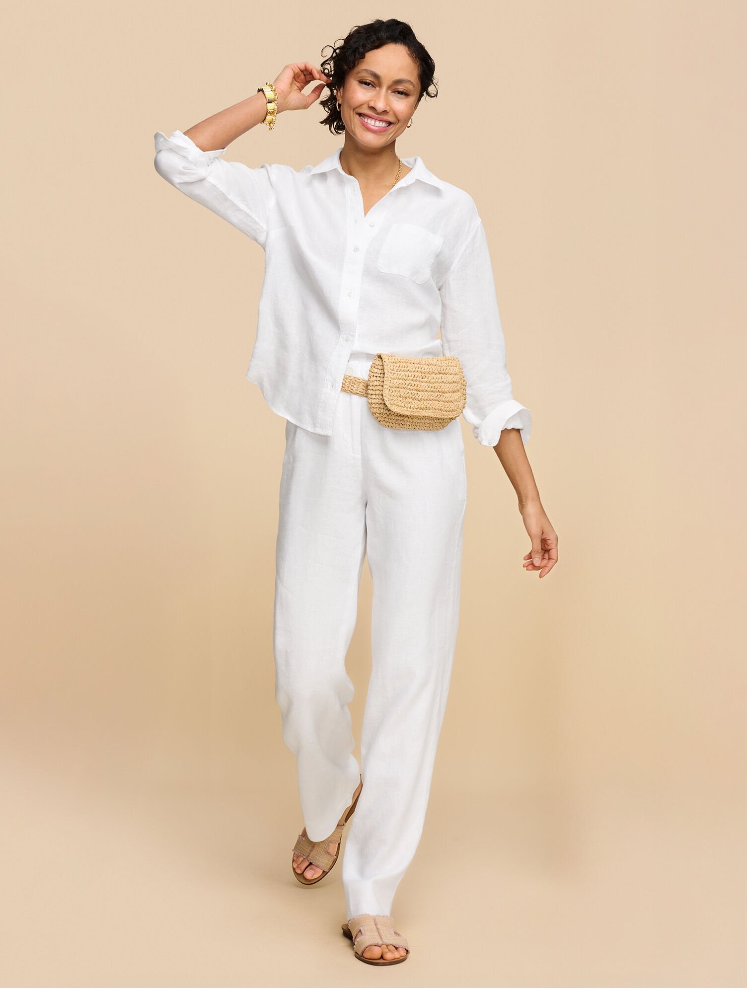 Live in linen this season with our modern, boxy shirt. Detailed with a patch pocket at the chest. Silhouette looks amazing with your favorite linen or denim shorts.