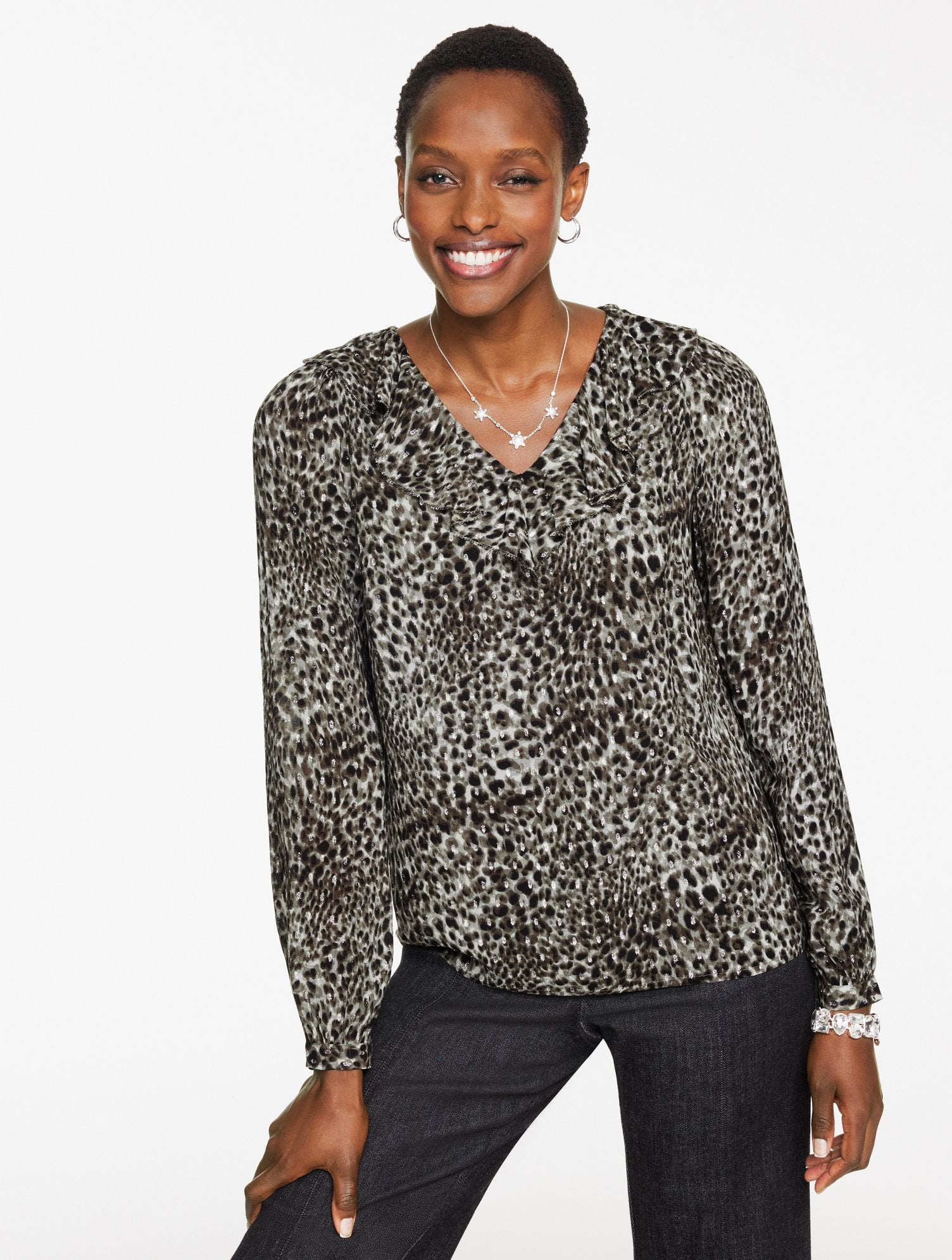 Spot-on style. Metallic threads illuminate the swirly leopard print on this flattering, V-neck top. Transitions effortlessly from office to dinner or date night.