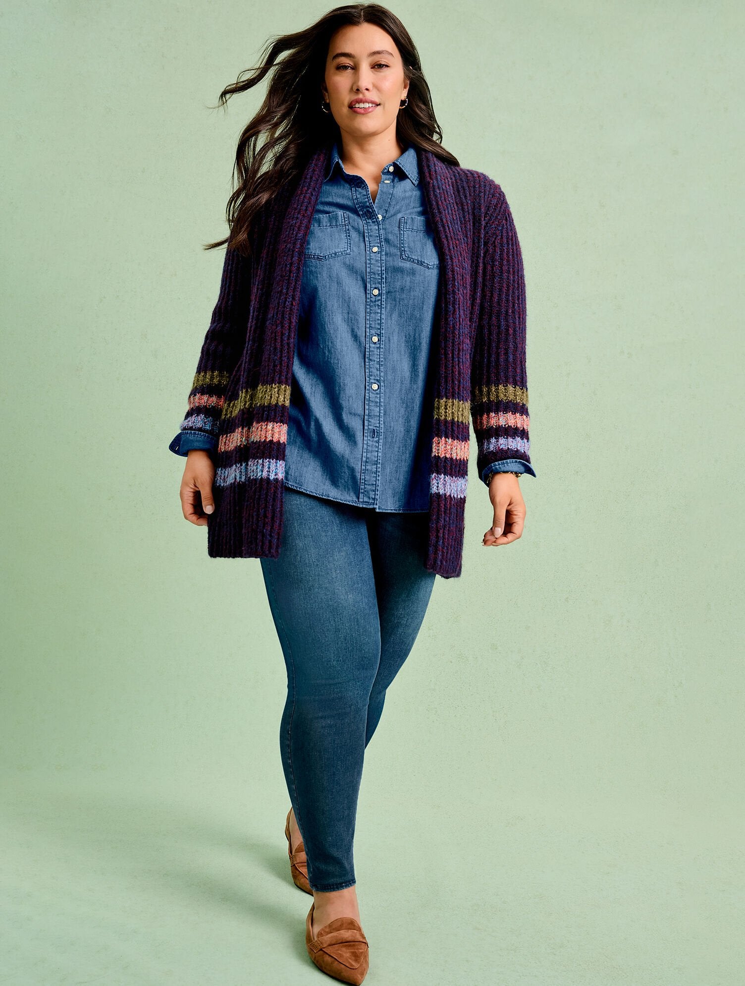 A draped open front makes this soft cardigan a breeze to throw on and go. Crafted in a marled stripe pattern blend with a shawl neck.
