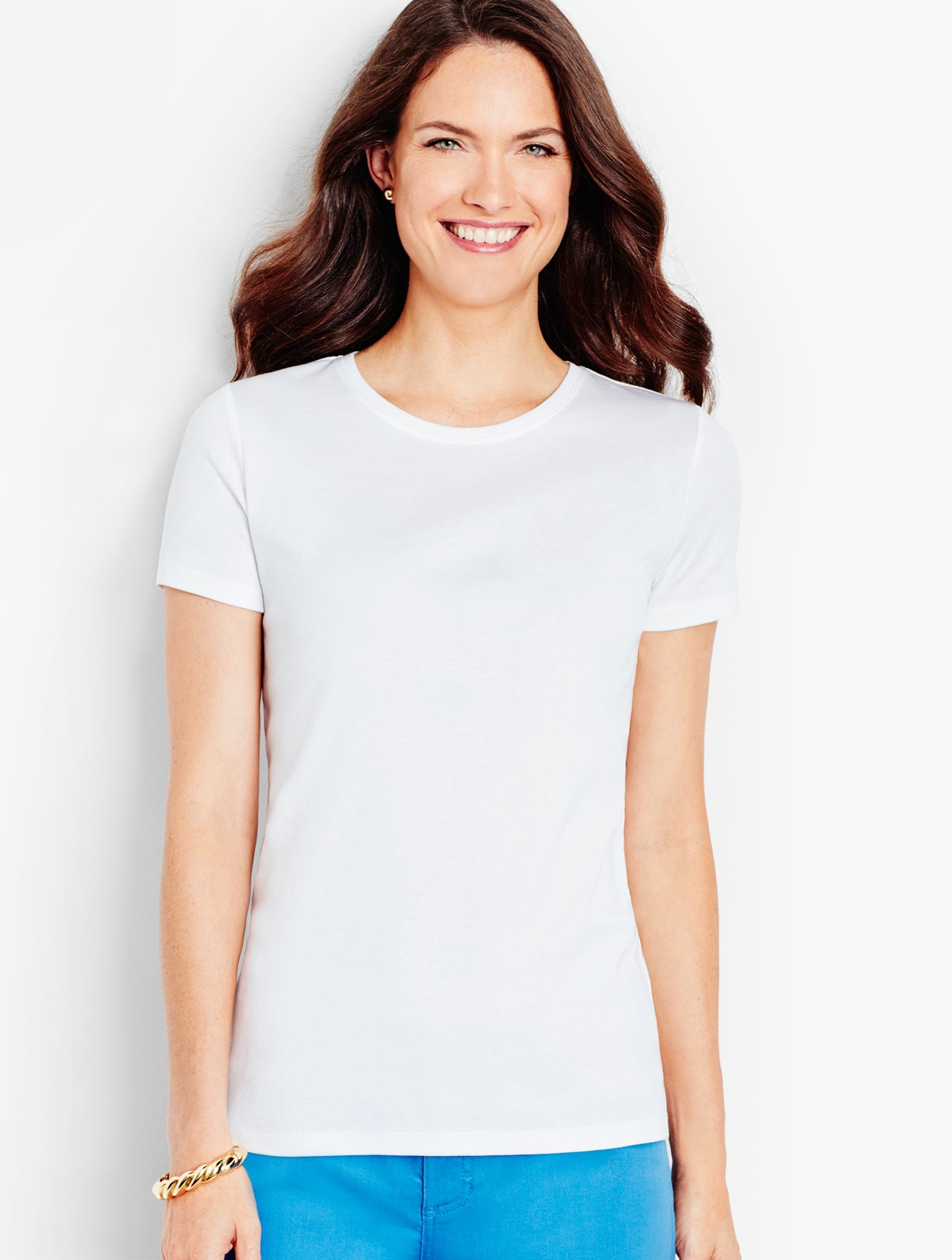 Our basic short-sleeve crewneck is back in three brand-new colors that are sure to become your closet mainstays. Simple yet impeccably soft, it's the fine-gauge knit of luxurious pima cotton that makes this tee so naturally alluring. The classic cut gives it an easy shape that flatters as a stand-alone, or creates a smooth foundation to build your look upon.