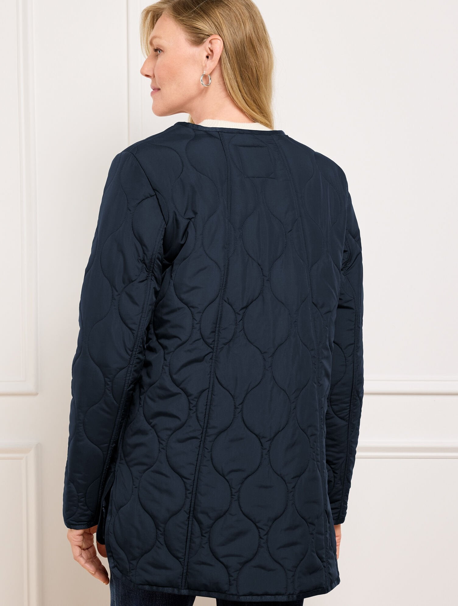 Our easygoing coat is the perfect last layer. Crafted in a collarless design with an eye-catching quilted finish. Detailed with button flap pockets.