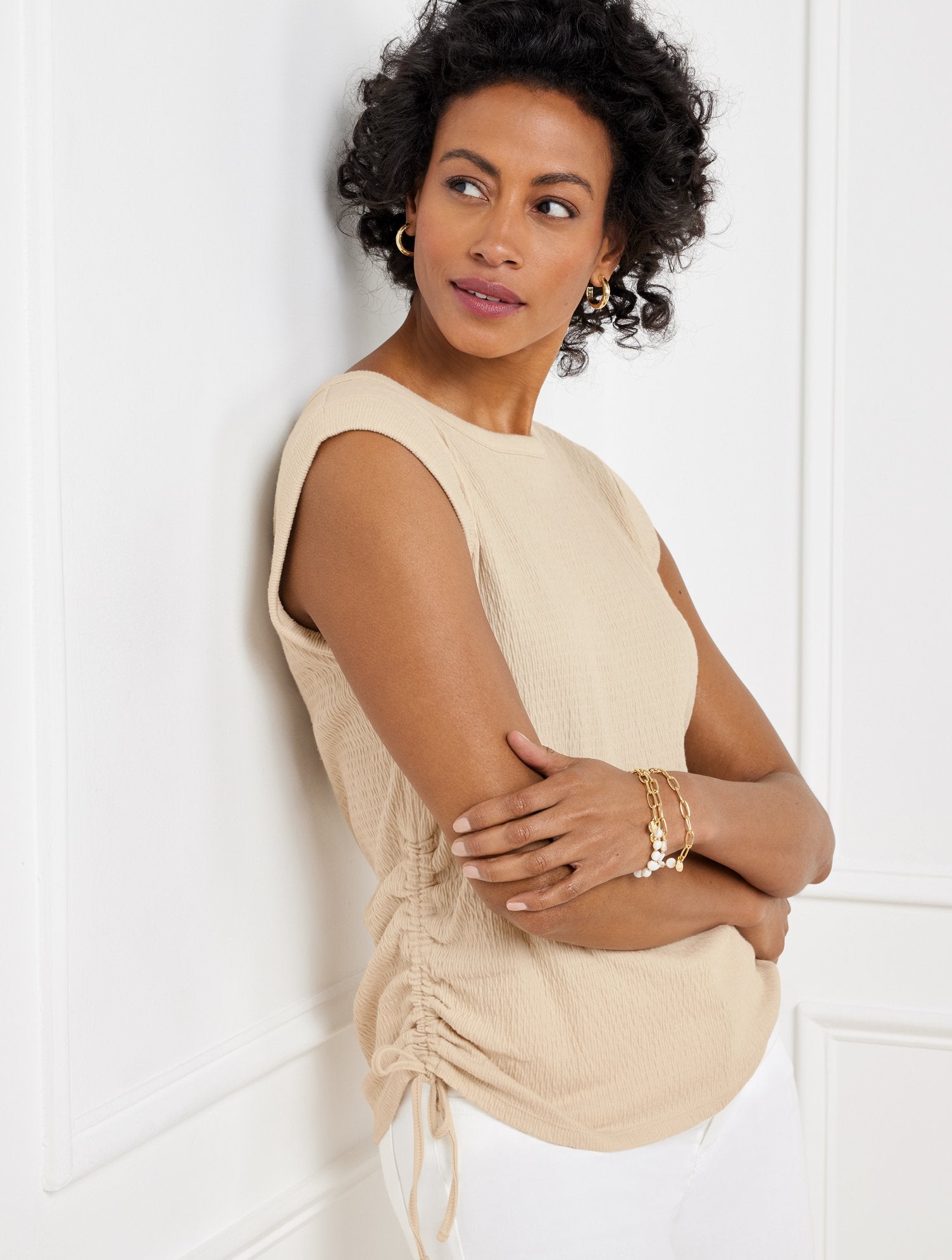 Ruched side ties shape our must-have crewneck t-shirt. Crafted with extended shoulder seams. An elevated closet essential.