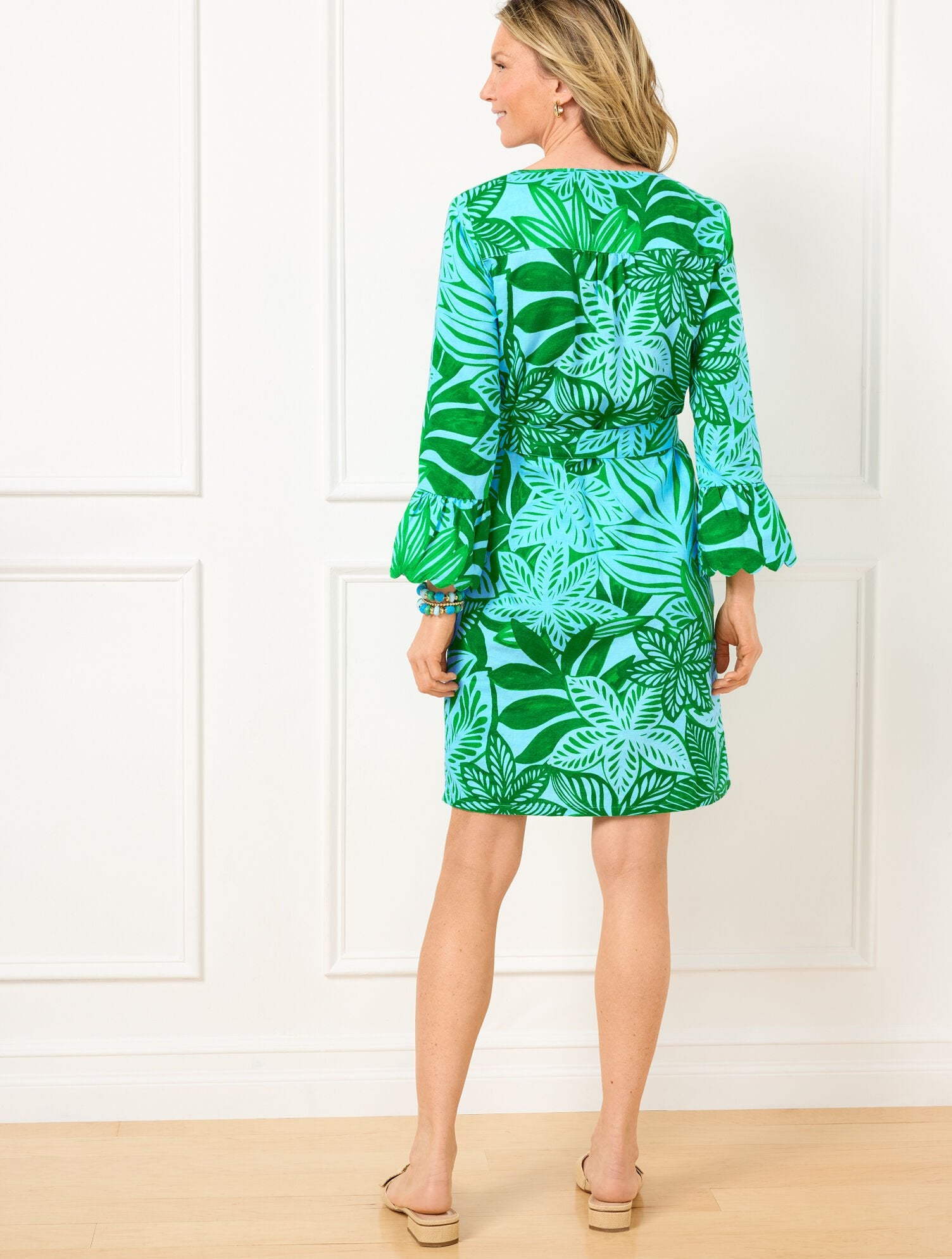 Nothing beats the ease of a linen blend tunic-style dress. Crafted in a watercolor botanical print and the prettiest ruffle sleeve cuffs. It's a wardrobe must-have.
