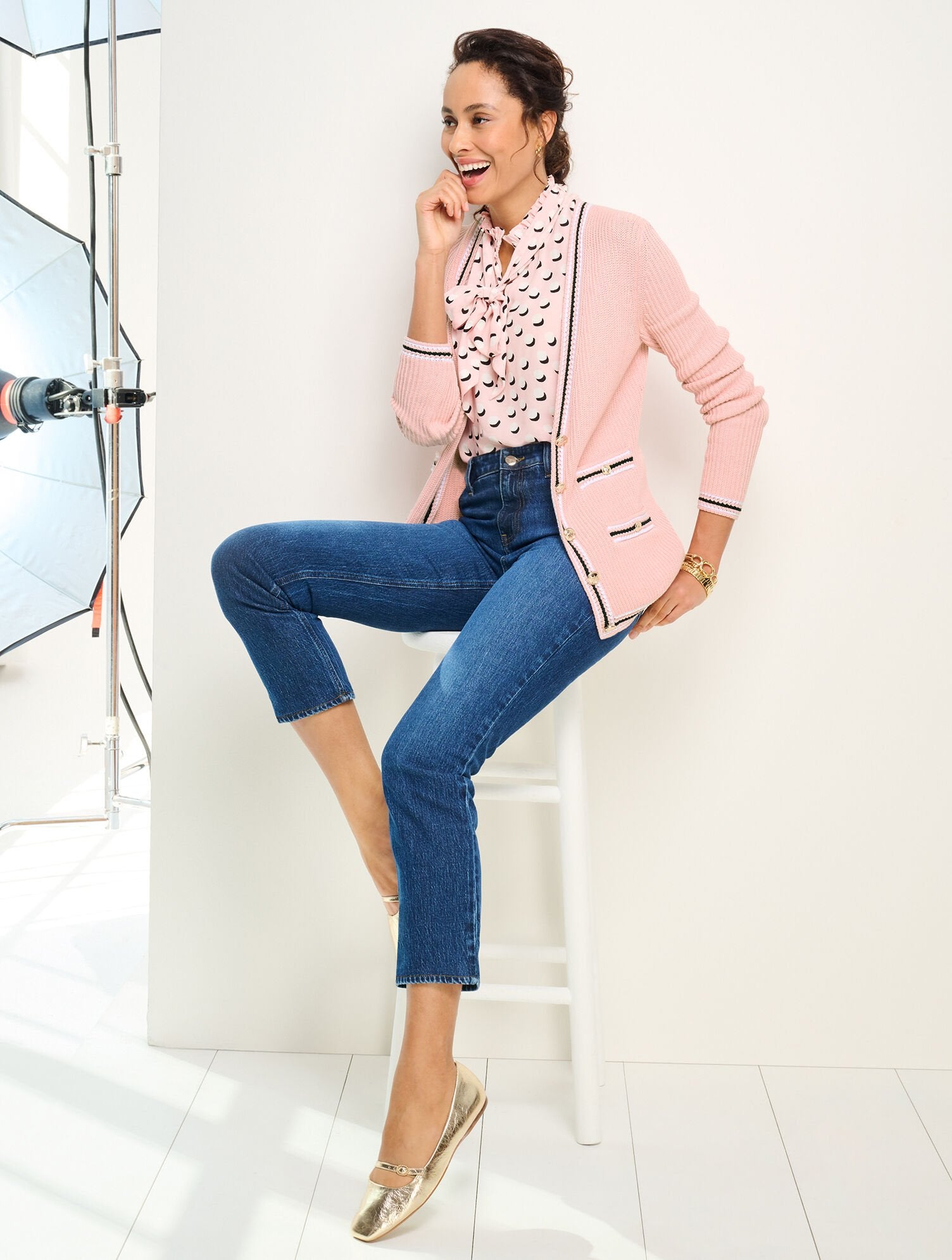 Chic ruffles at the neck add a playful charm to this dreamy sleeveless top. In a shadow dot pattern with a removable tie. Features a button with an elastic loop at the front neck.