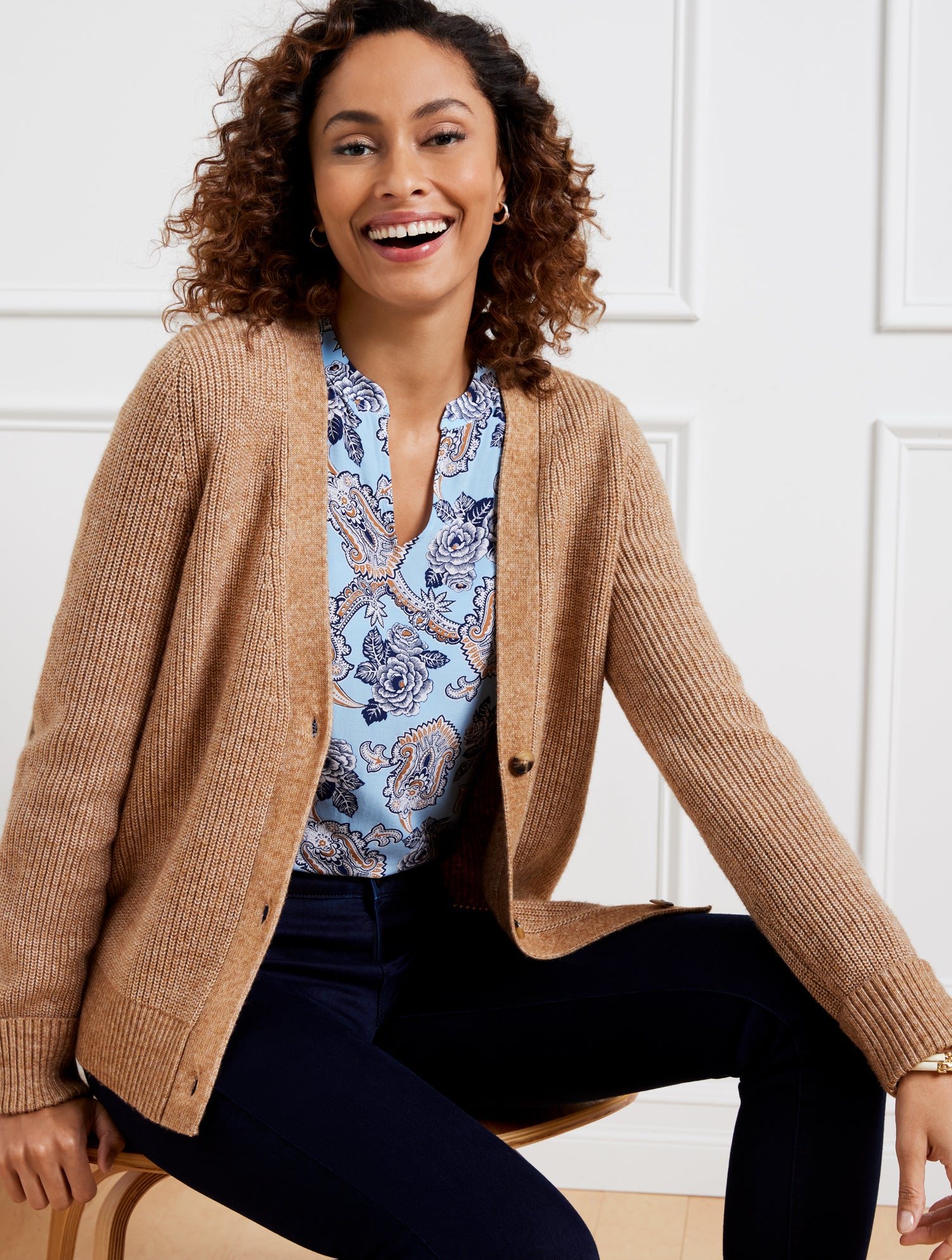 Our cozy layering staple in a relaxed silhouette. Crafted from lofty shaker stitch for textured detail and a breathable feel. Features cuffed bend back sleeves, a flattering V-neckline and rib knit trims.