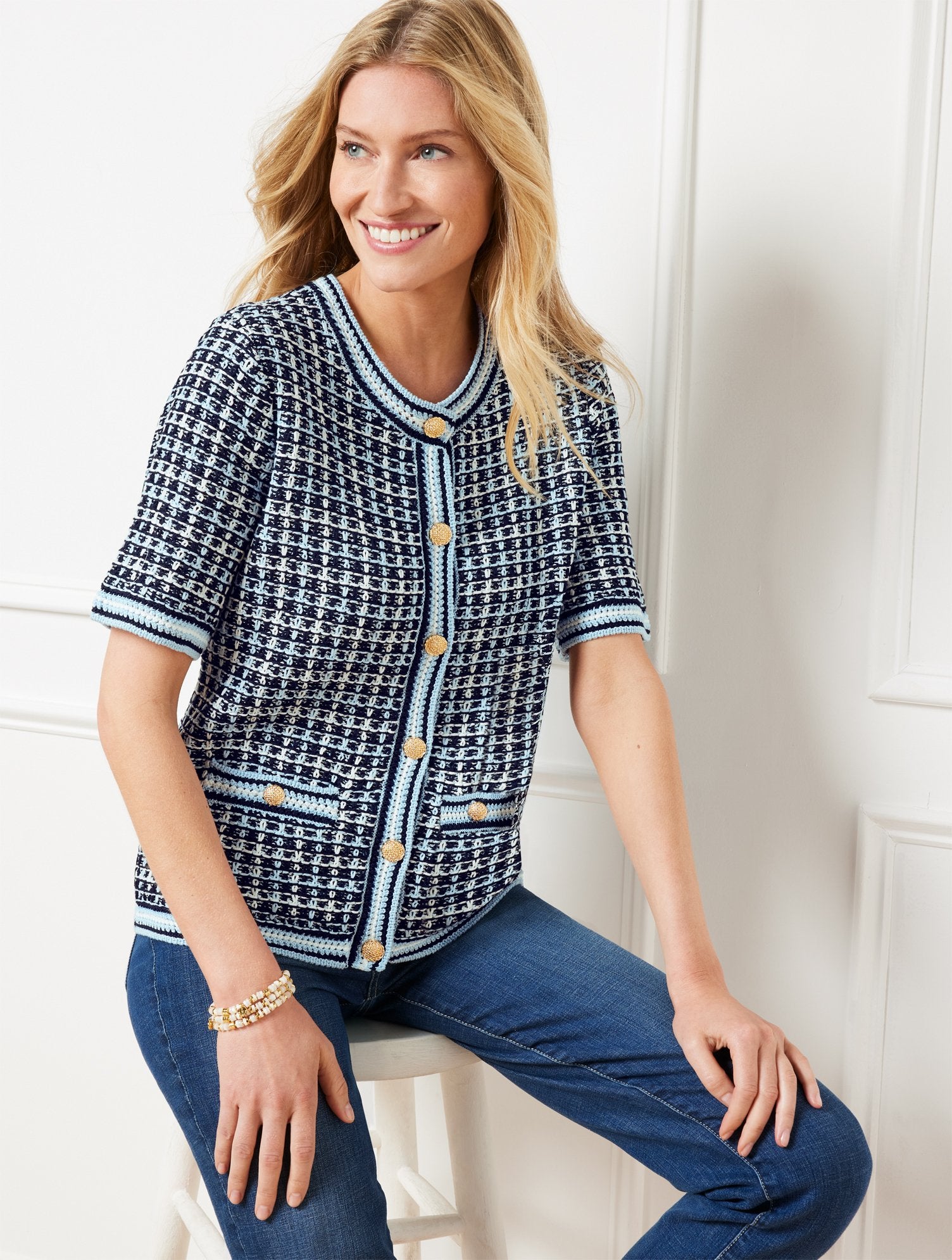 Add just-right texture to your look with our have-to-have short sleeve cardigan. In a charming plaid texture with a classic crewneck.