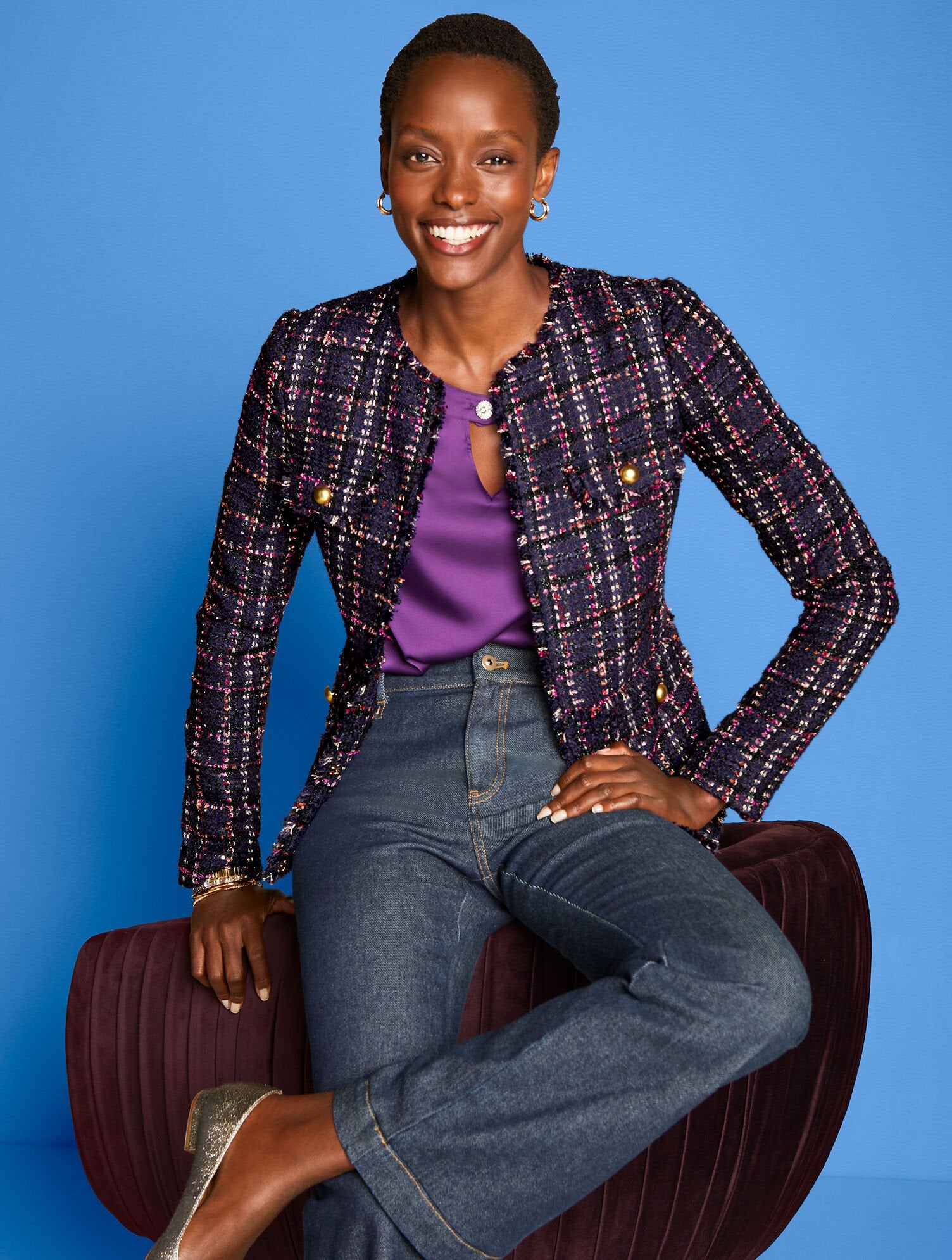 Elevate your closet this season with this elegant silky satin charmeuse top. Detailed with a button at the neck and chic slits at the sleeves.