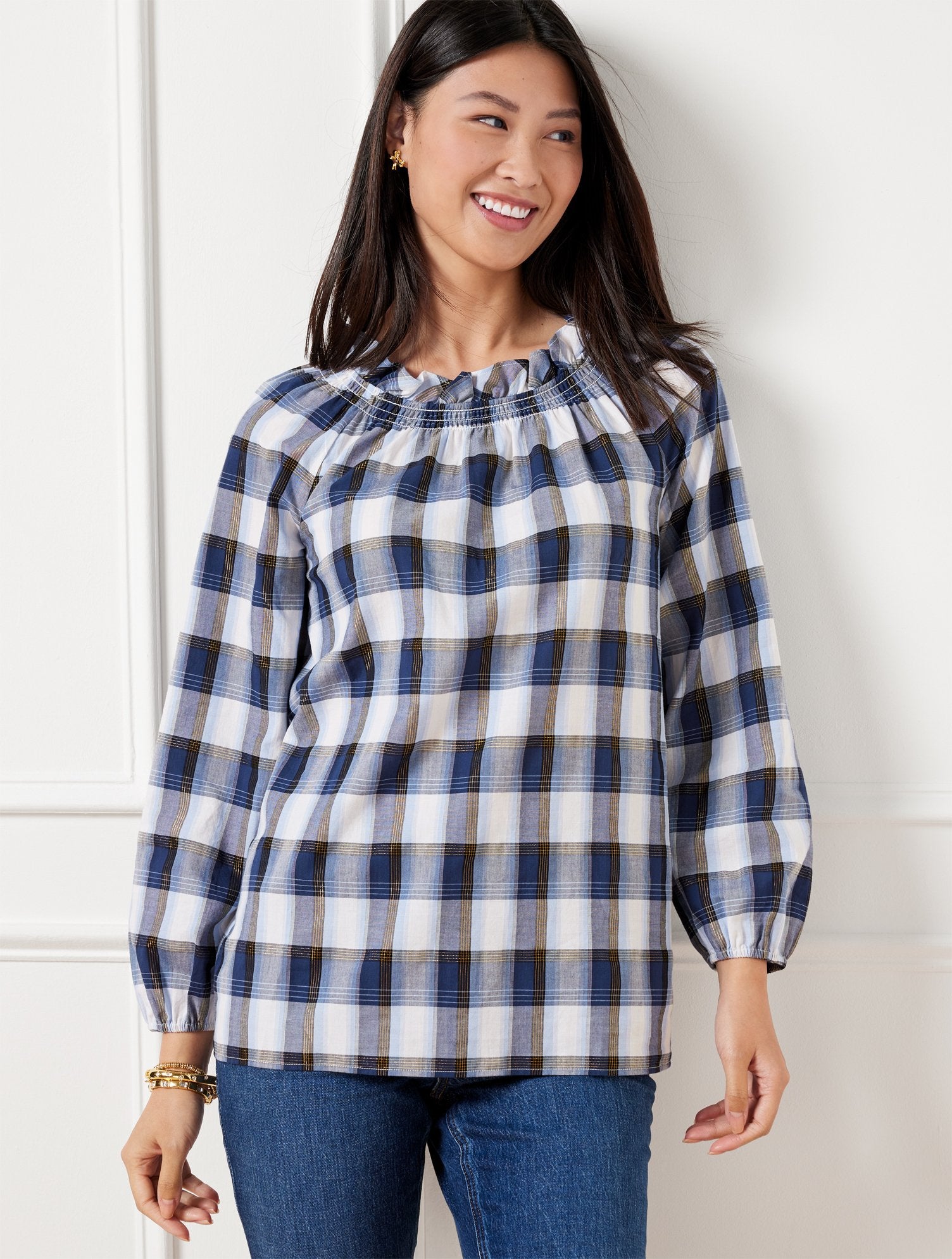Your favorite feminine top in a sparkly tinsel tartan pattern. Beautifully detailed with smocking at the neckline. Finished with a keyhole back opening.