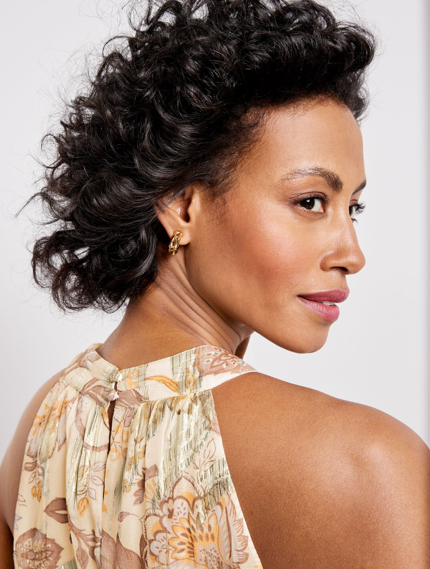 Add a sophisticated touch to your warm-weather wardrobe with this must-have halter top in a climbing floral pattern with a hint of metallic shimmer. Features a chic tie at the neck and a keyhole opening at the back.