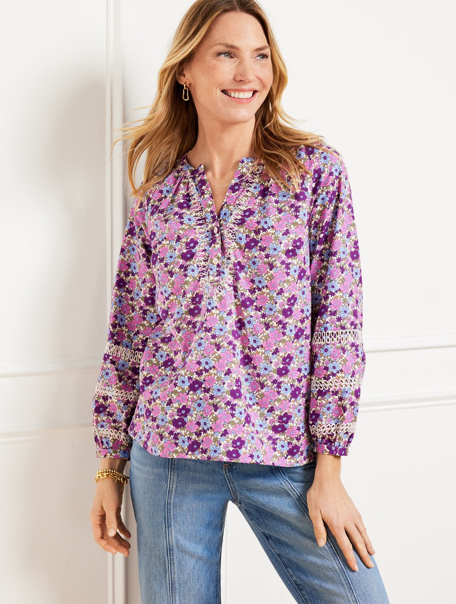 Blooming floral embroidery adds a modern touch to our ever-flattering popover top. Detailed with gorgeous bracelet sleeves.