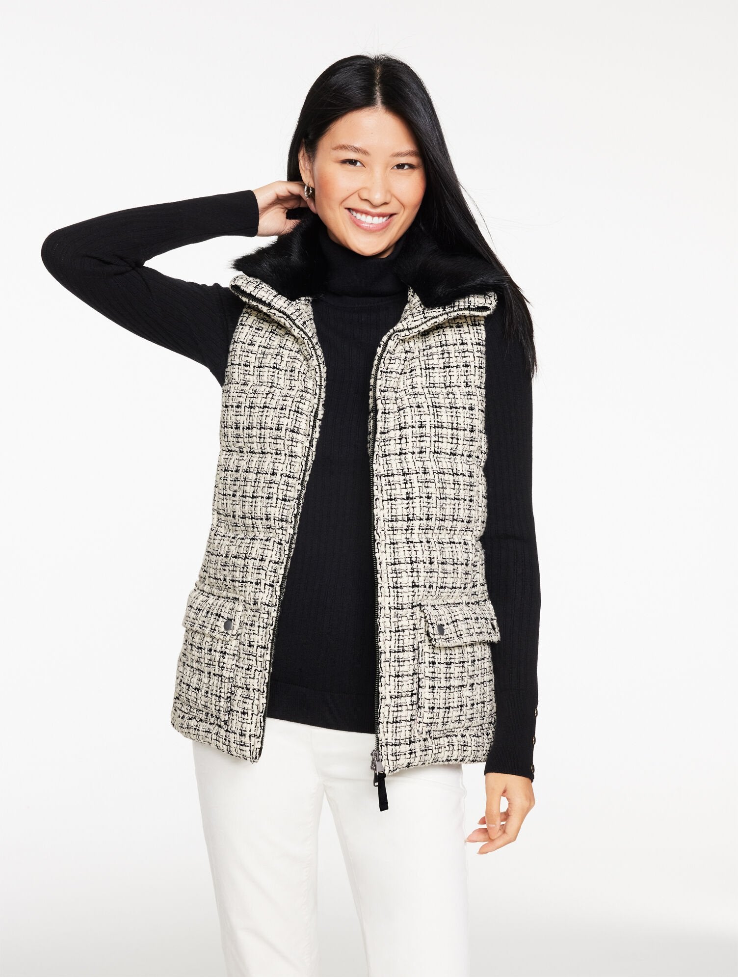 Our much-loved puffer vest in an elegant tweed texture. Crafted with patch front pockets and a full zip front closure. A cold-weather favorite. Hits at the hip.