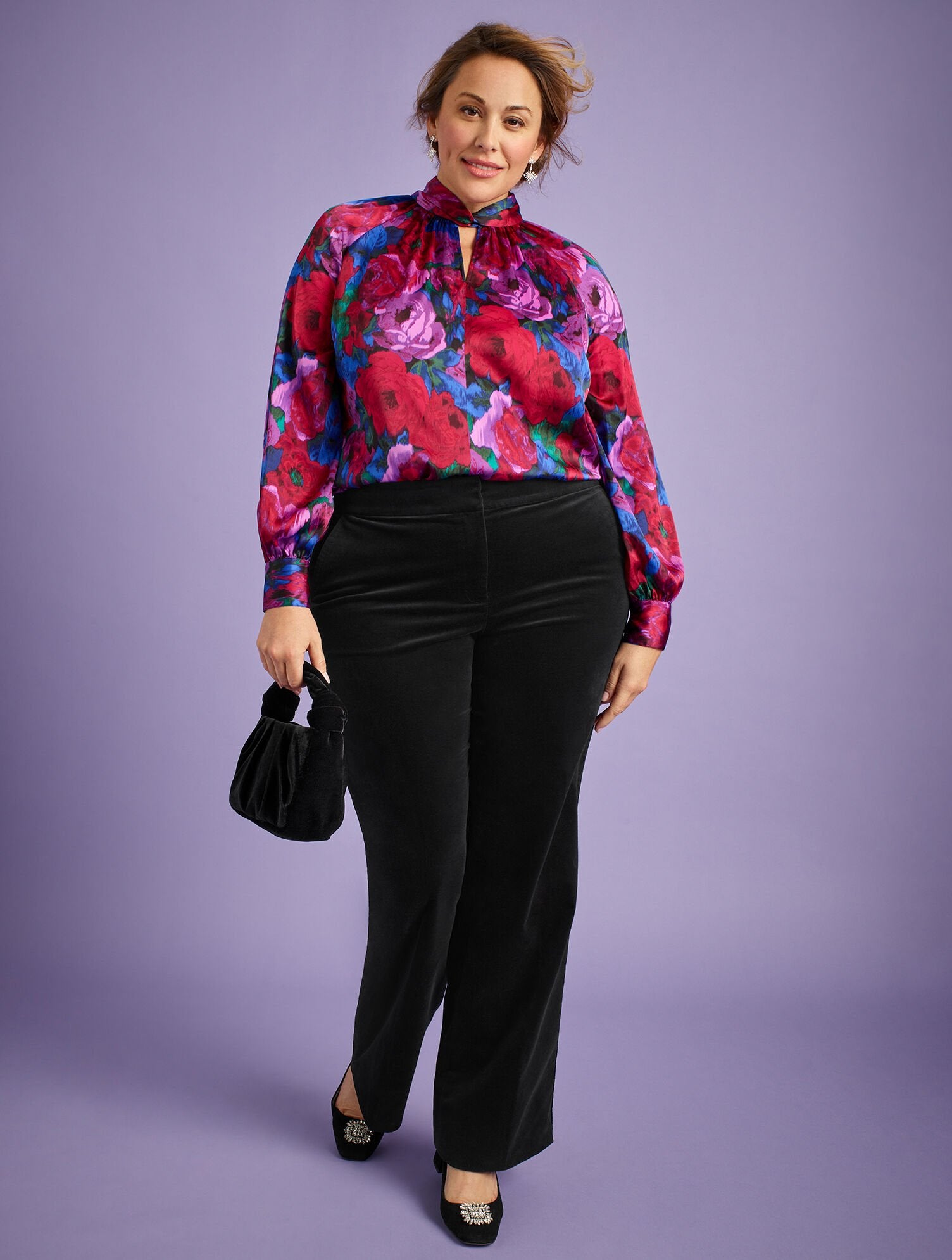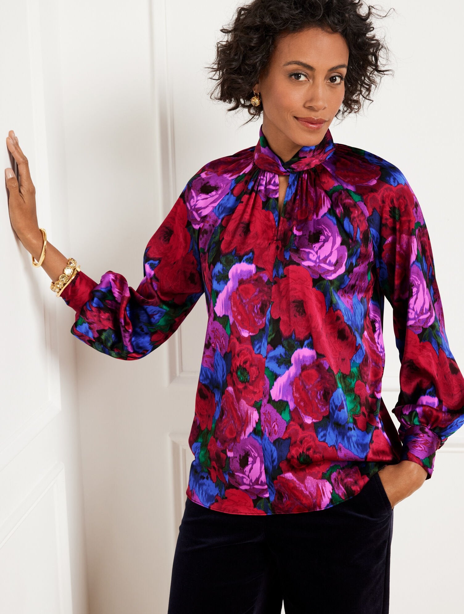 A chic twisted neckline elevates this fabulous top. In a wrapped floral print. Crafted from silky soft charmeuse with a buttoned elastic loop at the back keyhole opening.