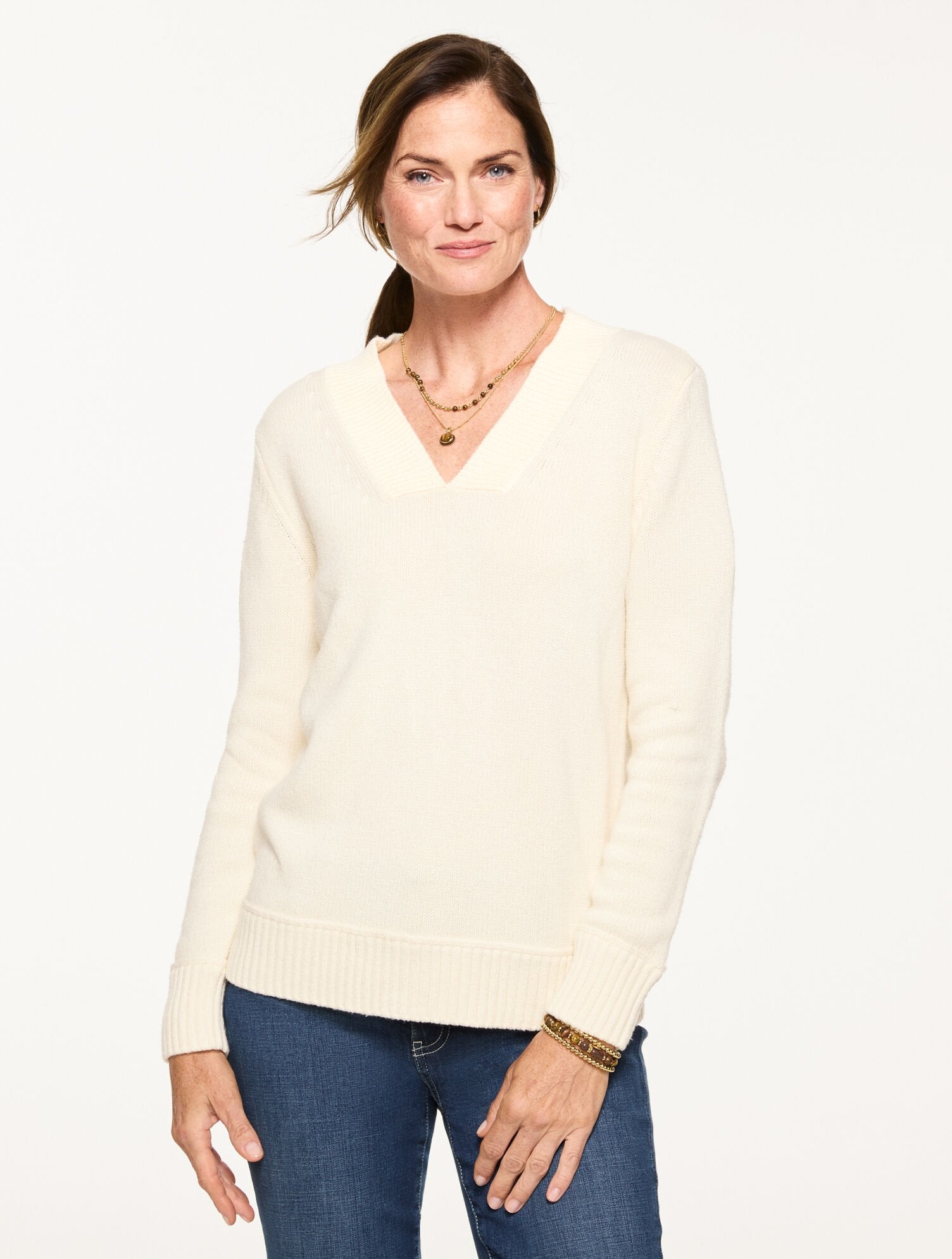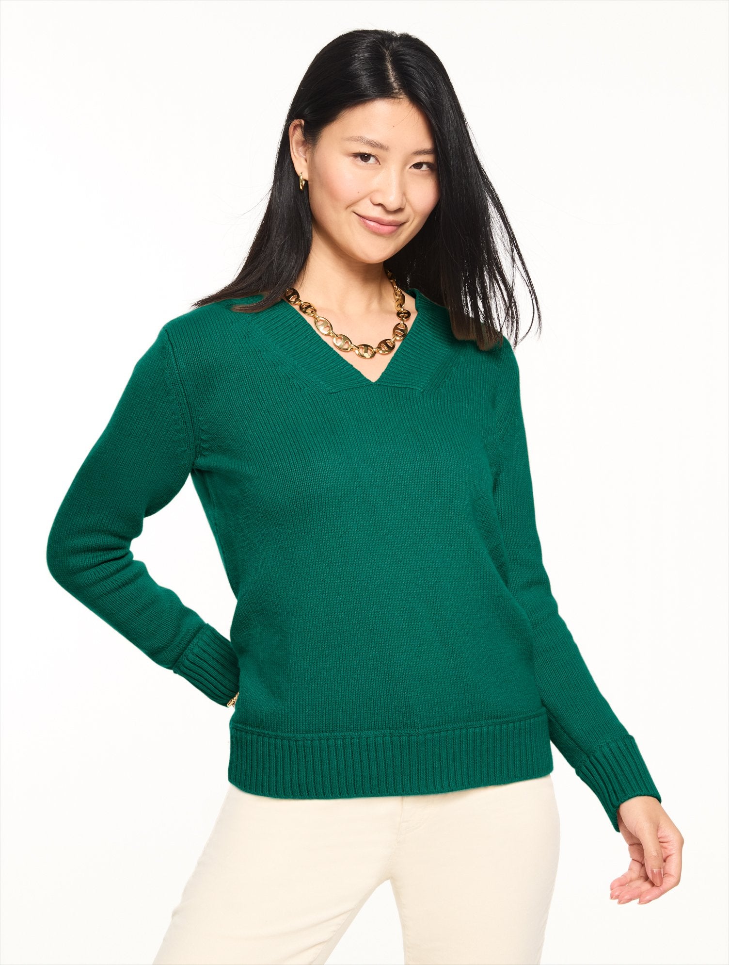 A flattering V-neck makes this relaxed sweater an effortless pick for the season. Crafted from a soft cotton blend with rib knit trim. The perfect addition to your knitwear collection.