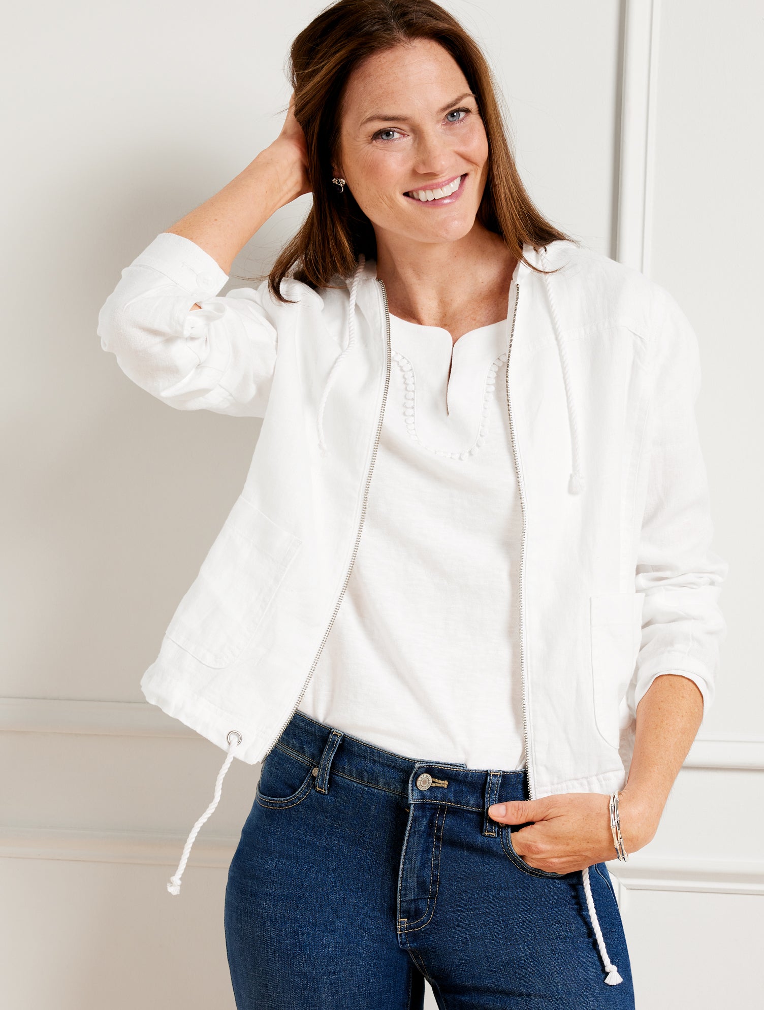 Our easy, breezy jacket in luxe, washed linen. Made in a relaxed, cropped fit with an adjustable drawstring waist. Utility-inspired pockets add a polished touch.