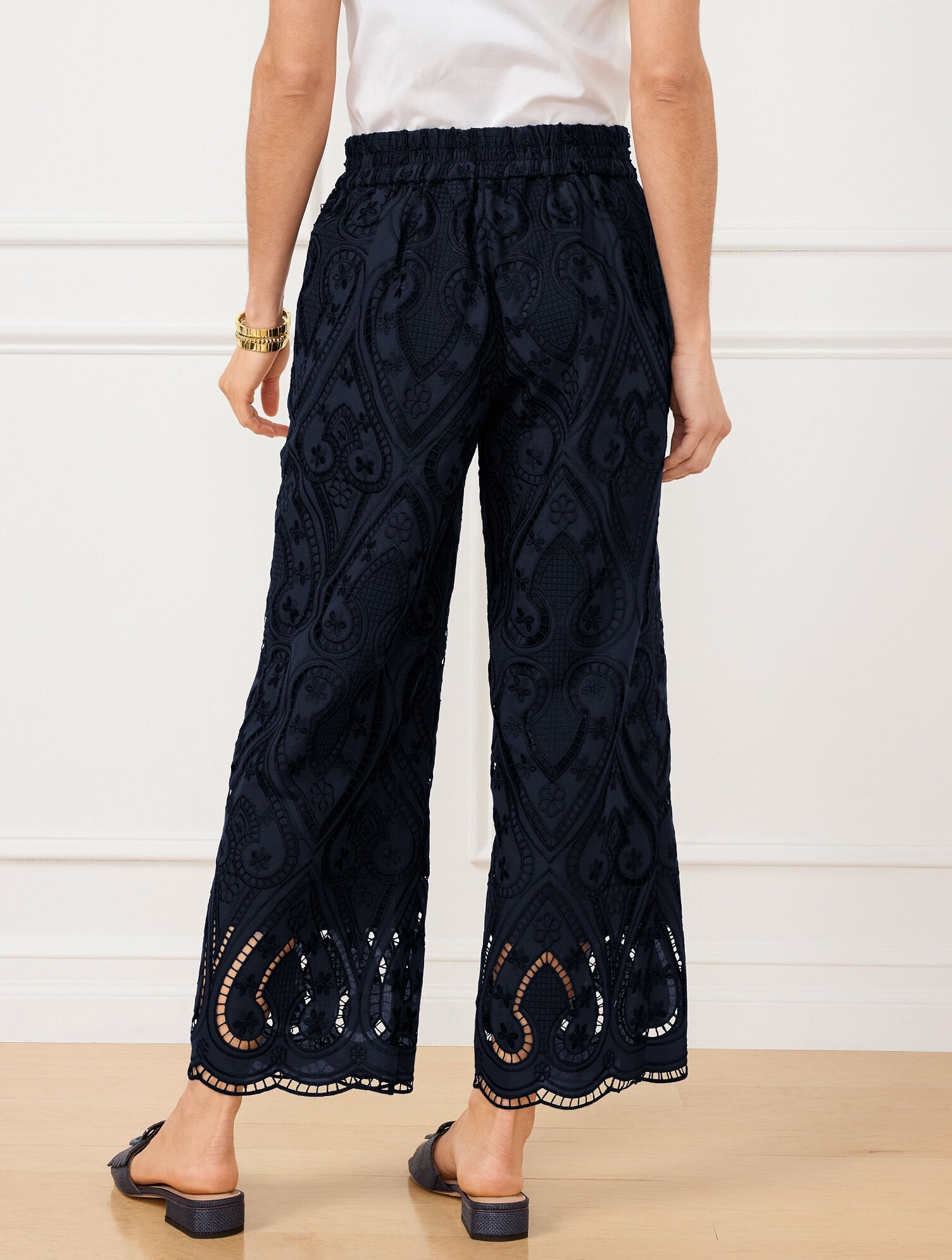 Our cropped wide leg pants are detailed with breezy eyelets. Effortless pull-on styling with an easy elastic back waist. A comfortable addition to your weekend wardrobe.