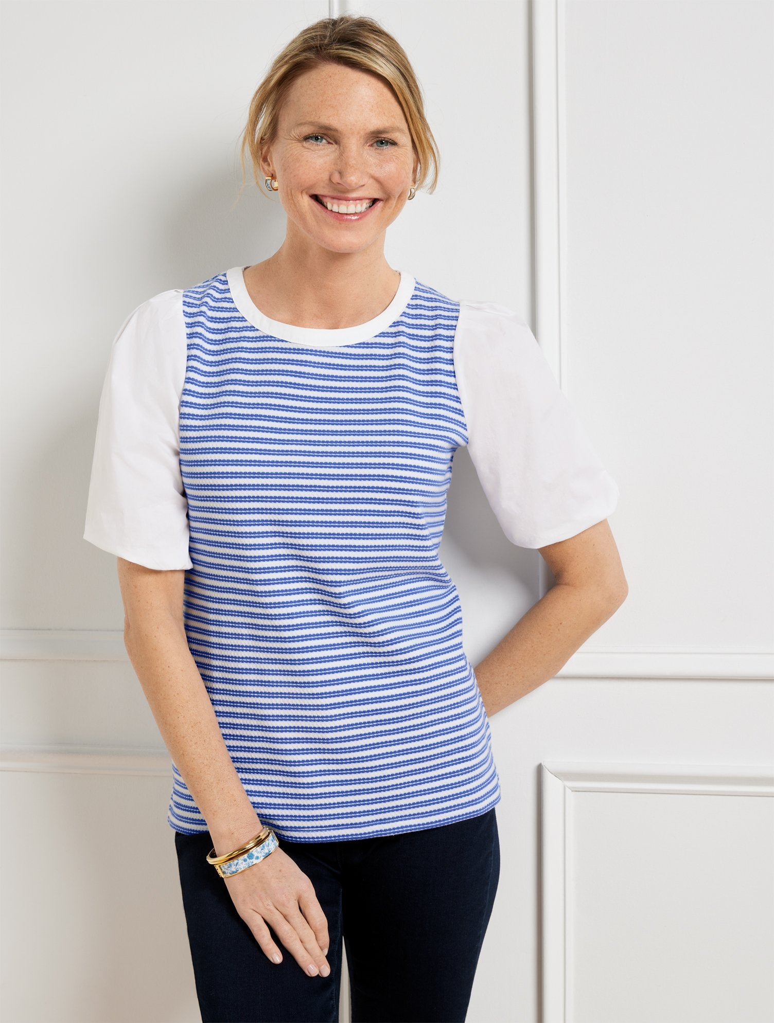 An elevated essential with a feminine twist. In an easy, relaxed fit. Woven detail at the sleeves adds an eye-catching touch. Complete with a scallop stripe print.