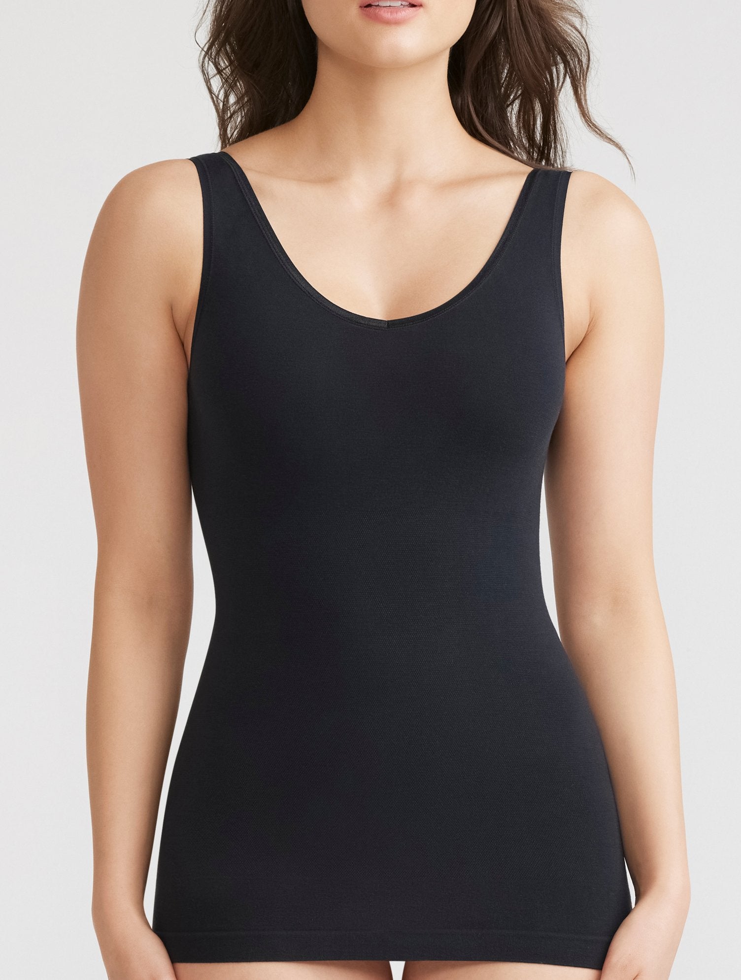 Create a smooth look under every look with this breathable shaping tank. The reversible design features a scoop neck on one side and a V-neck on the other. This convertible tank does it all.
